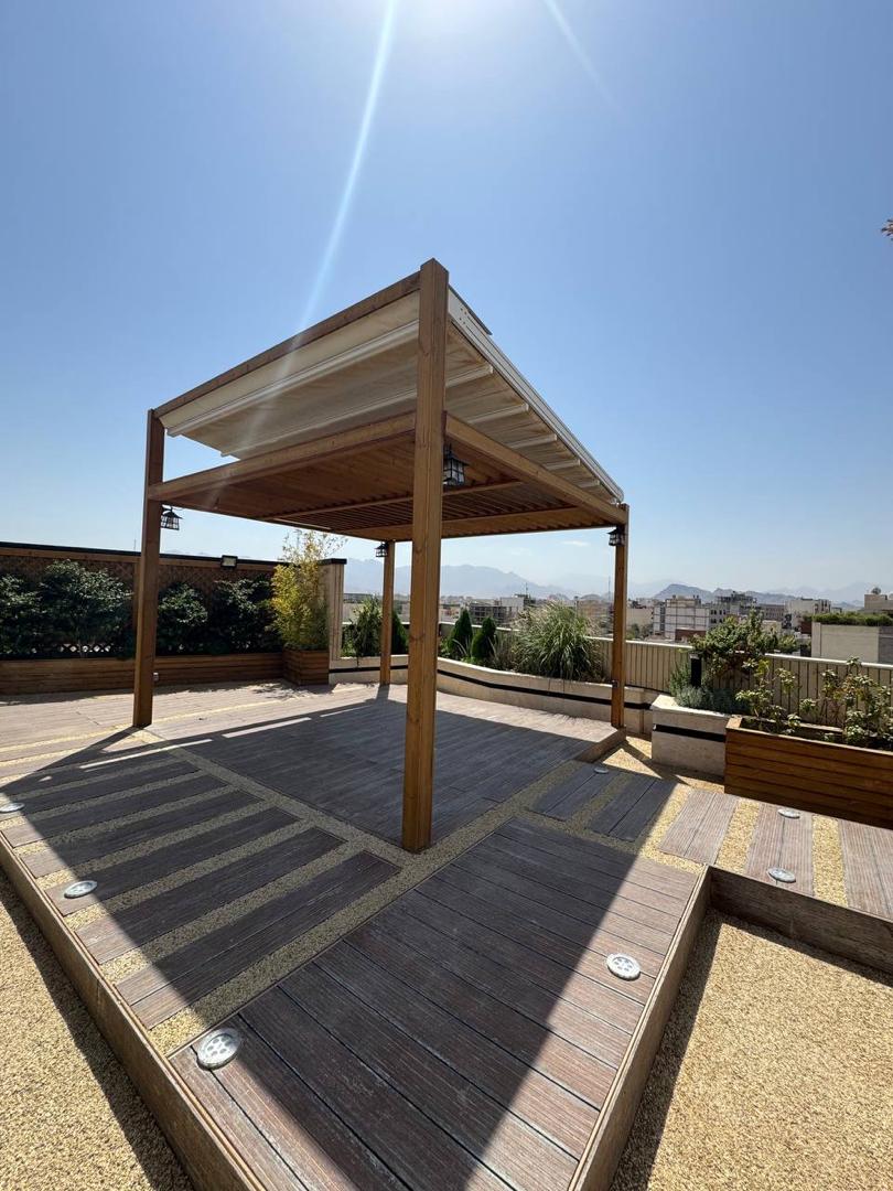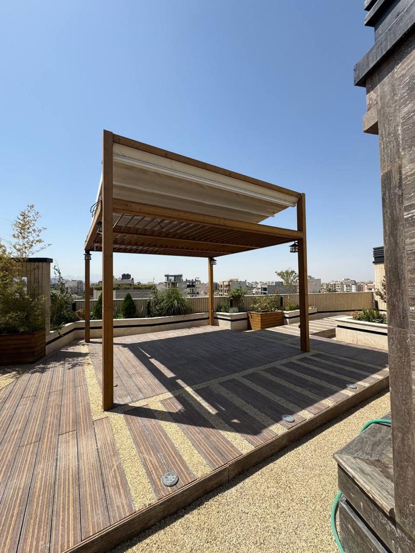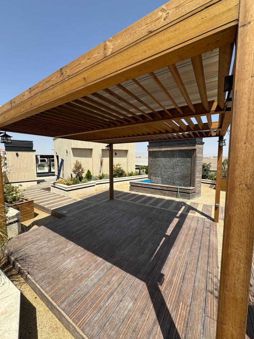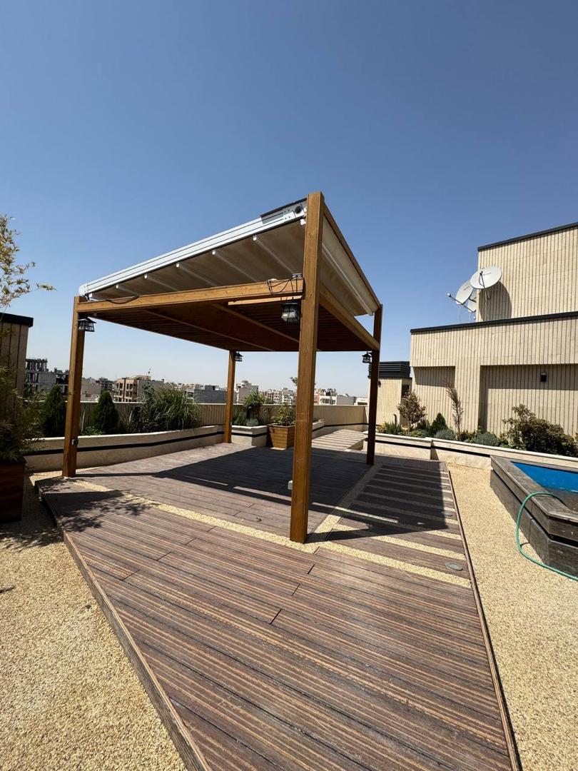 - نوع سازه: آلاچیق چوبی (پرگولا) با پوشش سقف متحرک پارچهای